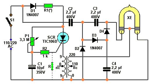 Um projeto simples e eficiente para uma lâmpada estroboscópica. A alta tensão para a plena ignição da lâmpada de xenônio é obtida mediante o recurso de um circuito triplicador de tensão.