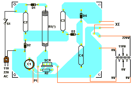 A freqüência das piscadas dependerá do valor de C1 e do ajuste do ponto ideal de disparo do SCR, o que é feito via P1. A seguir, o circuito esquemático e sugestões para o circuito impresso e montagem da placa.